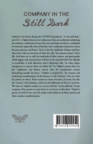 Isolated in her home during the COVID-19 pandemic, "in the still dark," poet M. L. Triplett discovers (or rediscovers) there are multitudes inhabiting her solitude: a multitude of voices (her own and those of others), a multitude of memories (especially those of family), and a multitude of questions about her past, present, and future. There is also the multitude of hopes and fears that come with an awareness of what she calls "the autumn season" of her life. And there are, as well, the multitude of allies, totems, and spirit guides which appear and communicate with her in the natural world. Her solitude is crystal-like; it both illumines and is illumined. But "no color, shape, transparency or power alone can define [it]:' In Triplett's poems there are her "epiphanies and history shared with the transplanted crinum flourishing outside the fence." Triplett is inspired by "the seasons and continuing transformation of all existence in the Universe"; they are what her poems are about. These seasons are those of nature, of course, but also the "seasons" of Ecclesiastes, which are the diffraction of Time in our lives. We who are Triplett's readers, we, too are with her" in the still dark." In the company of her poems we may learn to see better in this dark. Triplett's poems are full of new eyes for readers with which to see these seasons and their ceaseless transformations.