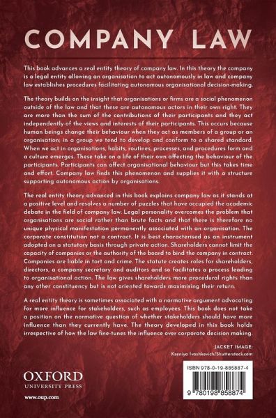 This book advances a real entity theory of company law, in which the company is a legal entity which acts autonomously in law, and company law establishes procedures facilitating autonomous organisational decision-making. The theory builds on the insight that organisations or firms are a social phenomenon outside of the law and that these are autonomous actors in their own right. They are more than the sum of the contributions of their participants and they act independently of the views and interests of their participants. This occurs because human beings change their behaviour when they act as members of a group or an organisation; in a group we tend to develop and conform to a shared standard, and when we act in organisations habits, routines, processes, and procedures form and a culture emerges. These take on a life of their own affecting the behaviour of the participants. Participants can affect organisational behaviour but this takes time and effort. Company law finds this phenomenon and supplies it with a structure supporting autonomous action by organisations. The real entity theory advanced in this book explains company law as it stands at a positive level. Legal personality overcomes the problems that organisations are social rather than brute facts and that there is no unique physical manifestation permanently associated with an organisation. The corporate constitution is not a contract - it is best characterised as an instrument adopted on a statutory basis through private action. Shareholders cannot limit the capacity of companies or the authority of the board to bind the company in contract and companies are liable in tort and crime. The statute creates roles for shareholders, directors, a company secretary, and auditors and so facilitates a process leading to organisational action. The law also integrates the interests of creditors and stakeholders.