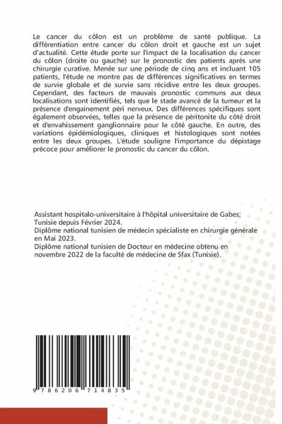 Le cancer du côlon est un problème de santé publique. La différentiation entre cancer du côlon droit et gauche est un sujet d'actualité. Cette étude porte sur l'impact de la localisation du cancer du côlon (droite ou gauche) sur le pronostic des patients après une chirurgie curative. Menée sur une période de cinq ans et incluant 105 patients, l'étude ne montre pas de différences significatives en termes de survie globale et de survie sans récidive entre les deux groupes. Cependant, des facteurs de mauvais pronostic communs aux deux localisations sont identifiés, tels que le stade avancé de la tumeur et la présence d'engainement péri nerveux. Des différences spécifiques sont également observées, telles que la présence de péritonite du côté droit et d'envahissement ganglionnaire pour le côté gauche. En outre, des variations épidémiologiques, cliniques et histologiques sont notées entre les deux groupes. L'étude souligne l'importance du dépistage précoce pour améliorer le pronostic du cancer du côlon.