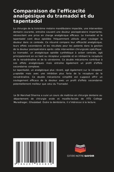 La chirurgie de la troisième molaire mandibulaire impactée, une intervention dentaire courante, entraîne souvent une douleur postopératoire importante, nécessitant une prise en charge analgésique efficace. Le tramadol et le tapentadol sont deux opioïdes fréquemment utilisés pour soulager la douleur dans ce contexte. Ce résumé compare leur efficacité analgésique, leurs effets secondaires et les résultats pour les patients dans la gestion de la douleur postopératoire après cette intervention chirurgicale spécifique.Le tramadol, un analgésique opioïde synthétique à action centrale, agit principalement en se liant au récepteur mi-opioïde et en inhibant la recapture de la noradrénaline et de la sérotonine. Ce double mécanisme contribue à ses effets analgésiques mais entraîne également un profil d'effets secondaires complexe.Le tapentadol, un analgésique plus récent, agit également sur le récepteur mi-opioïde mais avec une inhibition plus forte de la recapture de la noradrénaline. Ce double mécanisme simplifié est supposé offrir un soulagement efficace de la douleur avec un profil d'effets secondaires potentiellement meilleur que celui du Tramadol.