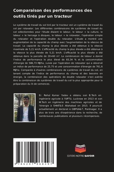 Le système de travail du sol tiré par le tracteur est un système de travail du sol par rotavator. Les différentes combinaisons de systèmes de travail du sol sélectionnées pour l'étude étaient le labour, le labour + la culture, le labour + le hersage à disques, le labour + le rotavator, l'opération simple du rotavator et l'opération double du rotavator. L'étude a montré une augmentation de la capacité du champ avec l'augmentation de la vitesse de travail. La capacité du champ la plus élevée a été obtenue à la vitesse maximale de 5,21 km/h. L'efficacité du champ la plus élevée a été obtenue à la vitesse la plus élevée de 5,21 km/h. L'efficacité la plus élevée a été obtenue dans la parcelle de 20×60 m². La combinaison de labour a donné l'indice de performance le plus élevé de 83,34 % et la consommation d'énergie de 586,73 MJ/ha, suivie par l'opération de rotavator qui a observé un indice de performance de 25,75 et une consommation d'énergie de 761,6 MJ/ha. Comparée à d'autres combinaisons de systèmes de travail du sol, en tenant compte de l'indice de performance du champ et des besoins en énergie, la combinaison des opérations de double rotavator s'est avérée être la combinaison de systèmes de travail du sol la plus appropriée pour la préparation du lit de semences.