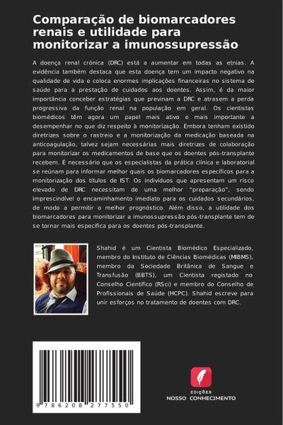 A doença renal crónica (DRC) está a aumentar em todas as etnias. A evidência também destaca que esta doença tem um impacto negativo na qualidade de vida e coloca enormes implicações financeiras no sistema de saúde para a prestação de cuidados aos doentes. Assim, é da maior importância conceber estratégias que previnam a DRC e atrasem a perda progressiva da função renal na população em geral. Os cientistas biomédicos têm agora um papel mais ativo e mais importante a desempenhar no que diz respeito à monitorização. Embora tenham existido diretrizes sobre o rastreio e a monitorização da medicação baseada na anticoagulação, talvez sejam necessárias mais diretrizes de colaboração para monitorizar os medicamentos de base que os doentes pós-transplante recebem. É necessário que os especialistas da prática clínica e laboratorial se reúnam para informar melhor quais os biomarcadores específicos para a monitorização dos títulos de IST. Os indivíduos que apresentam um risco elevado de DRC necessitam de uma melhor ¿preparaçãö, sendo imprescindível o encaminhamento imediato para os cuidados secundários, de modo a permitir o melhor prognóstico. Além disso, a utilidade dos biomarcadores para monitorizar a imunossupressão pós-transplante tem de se tornar mais específica para os doentes pós-transplante.