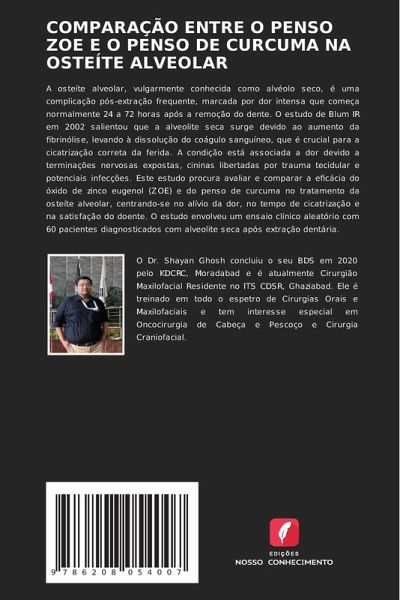A osteíte alveolar, vulgarmente conhecida como alvéolo seco, é uma complicação pós-extração frequente, marcada por dor intensa que começa normalmente 24 a 72 horas após a remoção do dente. O estudo de Blum IR em 2002 salientou que a alveolite seca surge devido ao aumento da fibrinólise, levando à dissolução do coágulo sanguíneo, que é crucial para a cicatrização correta da ferida. A condição está associada a dor devido a terminações nervosas expostas, cininas libertadas por trauma tecidular e potenciais infecções. Este estudo procura avaliar e comparar a eficácia do óxido de zinco eugenol (ZOE) e do penso de curcuma no tratamento da osteíte alveolar, centrando-se no alívio da dor, no tempo de cicatrização e na satisfação do doente. O estudo envolveu um ensaio clínico aleatório com 60 pacientes diagnosticados com alveolite seca após extração dentária.