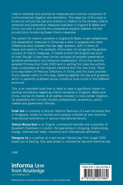 Interim remedies and provisional measures are a critical component of civil/commercial litigation and arbitration. This is an important book that is likely to have a significant impact on existing scholarship regarding interim remedies in England, Wales and China, and be of interest of all parties involved in cross-border litigation.