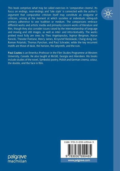 This book comprises what may be called exercises in 'comparative cinema'. Its focus on endings, near-endings and 'late style' is connected with the author's argument that comparative criticism itself may constitute an endgame of criticism, arising at the moment at which societies or individuals relinquish primary adherence to one tradition or medium. The comparisons embrace different works and artistic media and primarily concern works of literature and film, though they also consider issues raised by the interrelationship of language and moving and still images, as well as inter- and intra-textuality. The works probed most fully are ones by Theo Angelopoulos, Ingmar Bergman, Harun Farocki, Theodor Fontane, Henry James, Krzysztof Kieslowski, Chang-dong Lee, Roman Polanski, Thomas Pynchon, and Paul Schrader, while the key recurrent motifs are those of dusk, the horizon, the labyrinth, and the ruin.