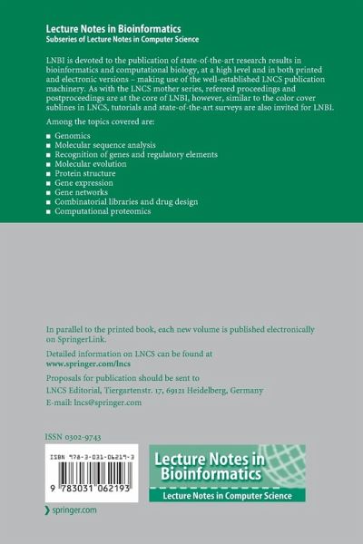 Evolution.- On the Comparison of Bacteriophage Populations.- Syntenic Dimensions of Genomic Evolution.- Phylogenetics.- Fast and Accurate Branch Support Calculation for Distance-based Phylogenetic Placements.- The Sackin Index of Simplex Networks.- Phylogenetic Placement Problem: A Hyperbolic Embedding Approach.- Phylogenetic Network Dissimilarity Measures That Take Branch Lengths Into Account.- Homology and Reconciliation.- The Complexity of Finding Common Partitions of Genomes with Predefined Block Sizes.- Reconciliation with Segmental Duplication, Transfer, Loss and Gain.- Quantifying Hierarchical Conflicts in Homology Statements.- On Partial Gene Transfer and its Impact on Gene Tree Reconstruction.- Genome Rearrangements.- Sorting by k-Cuts on Signed Permutations.- A New Approach for the Reversal Distance with Indels and Moves in Intergenic Regions.- Chromothripsis Rearrangements Are Informed by 3D Genome Organization.- Metagenomics.- Using Computational Synthetic Biology Toolsto Modulate Gene Expression within a Microbiome.- Metagenomics Binning of Long Reads Using Read-Overlap Graphs.- A Mixed Integer Linear Programming Algorithm for Plasmid Binning.- Genomic Sequencing.- Benchmarking Penalized Regression Methods in Machine Learning for Single Cell RNA Sequencing Data.- Deciphering the Tissue-speci c Regulatory Role of Intronless Genes Across Cancers.