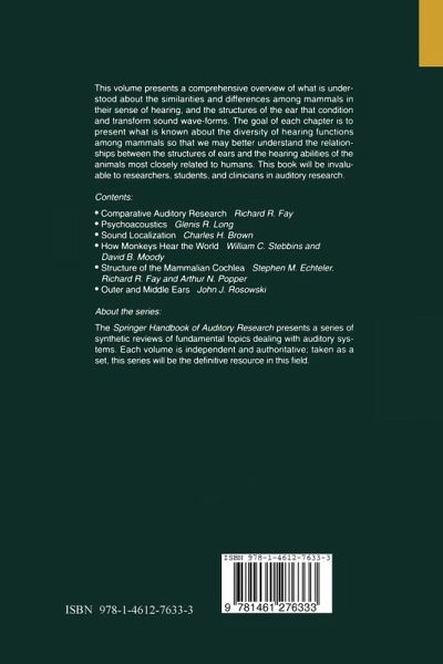 This volume presents a comprehensive overview of what is understood about the similarities and differences among mammals in their sense of hearing, and the structures of the ear that condition and transform sound wave-forms. The goal of each chapter is to present what is known about the diversity of hearing functions among mammals so that we may better understand the relationships between the structures of ears and the hearing abilities of the animals most closely related to humans. This book will be invaluable to researchers, students, and clinicians in auditory research.