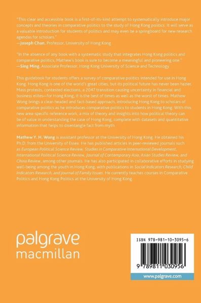 This guidebook for students offers a survey of comparative politics intended for use in Hong Kong. Hong Kong is one of the world's great cities, but its political future has never been hazier. Mass protests, contested elections, a 2047 transition causing uncertainty in financial and business elites- for Hong Kong, it is the best of times as well as the worst of times. Hong Kong University politics scholar Matthew Wong brings a clear-headed and fact-based approach, introducing Hong Kong to scholars of comparative politics even as he introduces comparative politics to students in Hong Kong, with this new area-specific reference work, a mix of theory and insights into how political theory can be of value in understanding the case of Hong Kong, complete with datasets and quantitative information that helps to disentangle fact from myth. For Hong Kong residents, scholars, students, and members of civil society, this book will be a breath of fresh air.