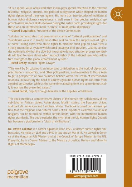 This book provides a comprehensive picture of the human rights diplomacy of the sub-Saharan African states, Asian states, Muslim states, the European Union, and the Latin American and Caribbean states. The book is based on the assumption that the religious and cultural norms of all important civilizations/cultures/religions can be reconciled, within certain limits, with the international human rights standards. The book explodes the myth that the UN Human Rights Council has become a platform for a "clash of civilizations".