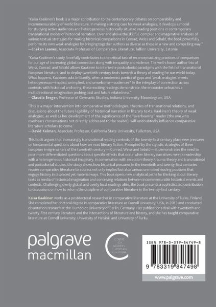 This book argues that increasingly transnational reading contexts of the twenty-first century place new pressures on fundamental questions about how we read literary fiction. Prompted by the stylistic strategies of three European émigré writers of the twentieth century - Conrad, Weiss and Sebald - it demonstrates the need to pose more differentiated questions about specific effects that occur when literary narratives meet a readership with a heterogeneous historical imaginary. In conversation with reception theory, trauma theory and transnational and postcolonial studies, the study shows how historical pressures in the twentieth and twenty-first centuries require comparative literature to address not only implied but also various unimplied reading positions that engage history in displaced yet material ways. This book opens new analytical paths for thinking about literary texts as media of historical imagination and conceiving relations between incommensurable historical events and contexts. Challenging overly global and overly local readings alike, the book presents a sophisticated contribution to discussions on how to reform the discipline of comparative literature in the twenty-first century.