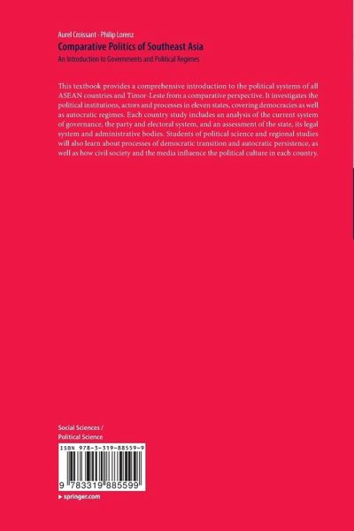 This textbook provides a comprehensive introduction to the political systems of all ASEAN countries and Timor-Leste from a comparative perspective. It investigates the political institutions, actors and processes in eleven states, covering democracies as well as autocratic regimes. Each country study includes an analysis of the current system of governance, the party and electoral system, and an assessment of the state, its legal system and administrative bodies. Students of political science and regional studies will also learn about processes of democratic transition and autocratic persistence, as well as how civil society and the media influence the political culture in each country.