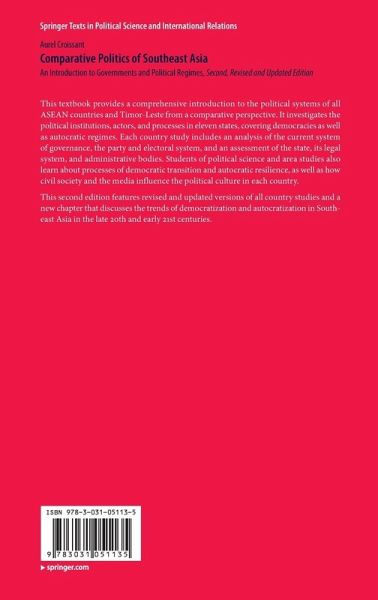 This textbook provides a comprehensive introduction to the political systems of all ASEAN countries and Timor-Leste from a comparative perspective. It investigates the political institutions, actors, and processes in eleven states, covering democracies as well as autocratic regimes. Each country study includes an analysis of the current system of governance, the party and electoral system, and an assessment of the state, its legal system, and administrative bodies. Students of political science and area studies also learn about processes of democratic transition and autocratic resilience, as well as how civil society and the media influence the political culture in each country.