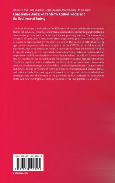 This book documents and analyses the differentiated control policies, the determinant factors behind, social resilience, and international relations during the pandemic from a comparative perspective in a facts-based, data-supporting manner. The intermittent outbreak of cases, public sentiments after long anxiety, questions over the efficacy of vaccines, have forced governments as well as the public to rethink differing approaches and policies in the combat against not just COVID, but the delta variant. In this context, this book establishes itself as a timely product, perhaps the first of its kind, to provide a widely covered individual country-based observation of policies, with an emphasis on multidimensional determinant factors behind the policies. A comparative study of social resilience during the pandemic constitutes another highlight of the book. The different policies tested social resilience differently in parameters such as mortality rates, vaccination coverage, social mobility, travel arrangements, trust in government, and general human development. Above and beyond observations and analyses at local and national levels, this book expands its scope to incorporate international relations, contemplating over the impacts of the pandemic on international relations, power shifts, and new world/global orders, crystallized in the indisputable rise of China.