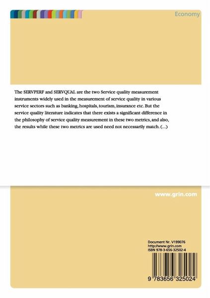 Master's Thesis from the year 2009 in the subject Business economics - Marketing, Corporate Communication, CRM, Market Research, Social Media, Sikkim Manipal University Bangalore (Manipal Institute of Technology), course: MBA , language: English, abstract: The SERVPERF and SERVQUAL are the two Service quality measurement instruments widely used in the measurement of service quality in various service sectors such as banking, hospitals, tourism, insurance etc. But the service quality literature indicates that there exists a significant difference in the philosophy of service quality measurement in these two metrics, and also, the results while these two metrics are used need not necessarily match. Hence, the problem identified in this research is: do these two metrics concur in their results, or is there a significant difference in their outcomes as applicable to a given service sector. The study also extends to the correlation between the outcomes of these two metrics and looking into the possibility of drawing implications based on the combined outcome.The research is partly qualitative and partly quantitative in nature. Qualitative in the sense that it analyses existing metrics of service quality based on meta-analysis and, through the use of secondary data, discusses the relative importance of both the metrics in service sectors. The research becomes quantitative, as it deals with descriptive statistics and tests various hypotheses using standard statistical tools. Keviat diagrams have been used to identify the service quality gaps.The research has clearly indicated that there is a significant difference in the outcomes of SERVQUAL and SERVPERF metrics. The reliability of the study was 0.8815, which is at adequately acceptable level. Tangibles and Reliability are highly scored, and Empathy and Assurance are least scored, whereas, Responsiveness is moderately scored Service quality dimension. It can be concluded that if meaningful outcome has to be obtained, both these metrics have to be applied to a service sector and based on the combined inference drawn, suggestions should be made for quality enhancement.