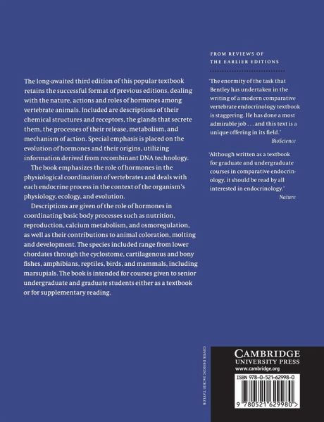 The third edition of this popular textbook retains the successful format of previous editions, dealing with the nature, actions and roles of hormones among vertebrate animals. Special emphasis is placed on the evolution and origins of hormones and their receptors, on the role of hormones in the physiological coordination of vertebrates, and on dealing with each endocrine process in the context of the organism's physiology, ecology and evolution. Comparative Vertebrate Endocrinology discusses the intimate physiology of the endocrine system and the pivotal role of hormones in coordinating basic body processes such as nutrition, reproduction, calcium metabolism and osmoregulation, as well as their contributions to animal coloration, molting and development. The species included range from lower chordates through to mammals, including marsupials.