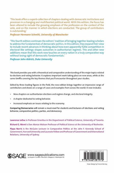New chapters on authoritarian elections and regime change, and electoral integrity A chapter dedicated to voting behaviour Increased emphasis on issues relating to the economy. Comparing Democracies, Fourth Edition will remain a must-read for students and lecturers of elections and voting behaviour, comparative politics, parties, and democracy.