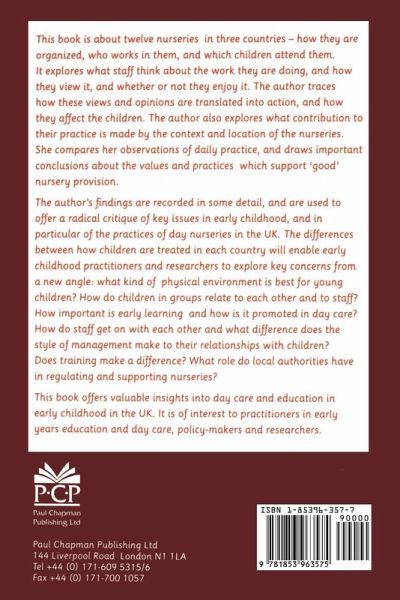 This book examines 12 nurseries in three countries - how they are organized, who works in them, and which children attend them. In particular, it explores what staff think about the work they are doing, how they view it, and whether or not they enjoy it. The author traces how these views and opinions are translated into action, and how they affect the children. She also explores what contribution the context and location of the nurseries makes to their practice. The author compares her observations of daily practice in these nurseries, and draws valuable conclusions about the values and practices which support 'good' nursery provision.