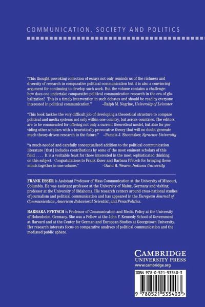 Frank Esser is Assistant Professor in the Institut fuer Publizistik at the University of Mainz, Germany. His research centers around cross-national studies of journalism and political communication. He has written articles for various journals, including the European Journal of Communications and the Harvard International Journal of Press Politics. Barbara Pfetsch is Professor of Communication and Media Policy at the University of Hohenheim, Germany. She was a fellow at the John F. Kennedy School of Government at Harvard and at the Center for German and European Studies at Georgetown University. Her research interests focus on comparative analyses of political communication and the mediated public sphere.