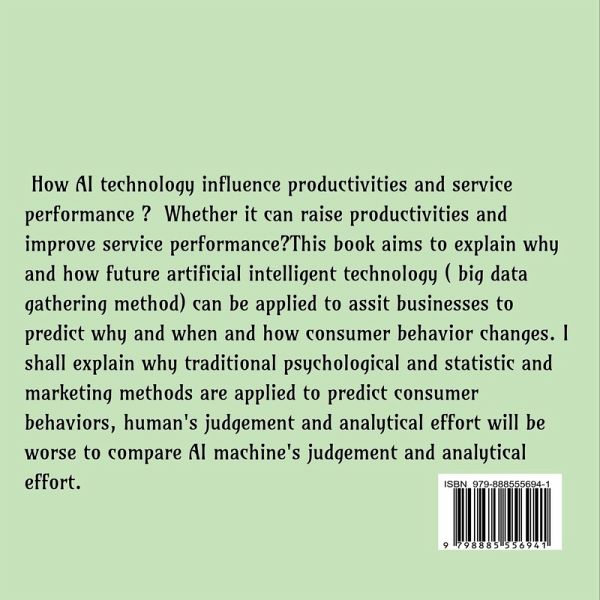 How AI technology influence productivities and service performance ? Whether it can raise productivities and improve service performance?This book aims to explain why and how future artificial intelligent technology ( big data gathering method) can be applied to assit businesses to predict why and when and how consumer behavior changes. I shall explain why traditional psychological and statistic and marketing methods are applied to predict consumer behaviors, human's judgement and analytical effort will be worse to compare AI machine's judgement and analytical effort. Also, I shall indicate different business organizations why they apply AI big data gathering method to help them to design any questionnaires ( surveys) questions which will be more valid and useful to conclude human's questionnaires ( surveys) design questions method.This book has these two research questions need to be answered? Can apply (AI) learning machine predict consumer behaviors? Can (AI) learning machine replace human marketing research method, e.g. survey or human psychological and micro and macro economic methods to predict consumer behaviors more accurate?