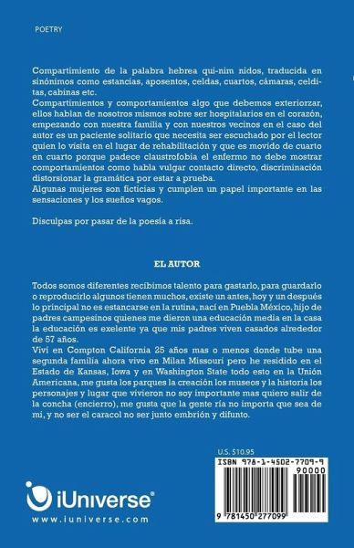 Compartimiento de la palabra hebrea qui-nim nidos, traducida en sinónimos como estancias, aposentos, celdas, cuartos, cámaras, celditas, cabinas etc. Compartimientos y comportamientos algo que debemos exteriorzar, ellos hablan de nosotros mismos sobre ser hospitalarios en el corazón, empezando con nuestra familia y con nuestros vecinos en el caso del autor es un paciente solitario que necesita ser escuchado por el lector quien lo visita en el lugar de rehabilitación y que es movido de cuarto en cuarto porque padece claustrofobia el enfermo no debe mostrar. comportamientos como habla vulgar contacto directo, discriminación distorsionar la gramática por estar a prueba. Algunas mujeres son ficticias y cumplen un papel importante en las sensaciones y los sueños vagos. Disculpas por pasar de la poesía a risa.