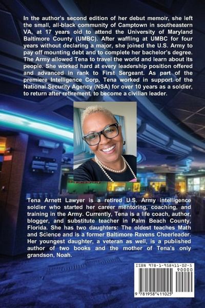 In the author's second edition of her debut memoir, she left the small, all-black community of Camptown in southeastern VA, at 17 years old to attend the University of Maryland Baltimore County (UMBC). After waffling at UMBC for four years without declaring a major, she joined the U.S. Army to pay off mounting debt and to complete her bachelor's degree. The Army allowed Tena to travel the world and learn about its people. She worked hard at every leadership position offered and advanced in rank to First Sergeant. As part of the premiere Intelligence Corp, Tena worked in support of the National Security Agency (NSA) for over 10 years as a soldier, to return after retirement, to become a civilian leader.
