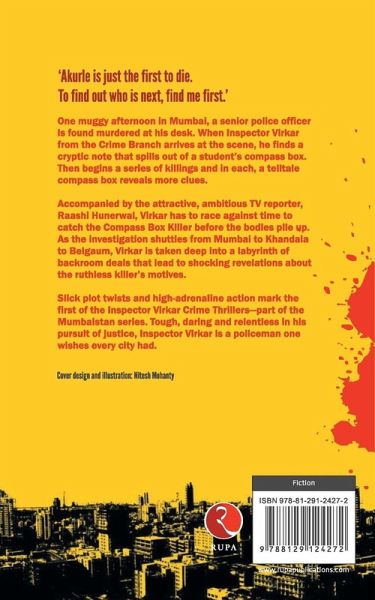 This book is a crime thriller, set in the by-lanes of Mumbai. One muggy afternoon, a senior police officer is found murdered at his desk. When Inspector Virkar from the Crime Branch arrives at the scene, he finds a cryptic note that spills out of a student's compass box. Then begins a series of killings and in each, a telltale compass box reveals more clues. Accompanied by the attractive, ambitious TV reporter, Raashi Hunerwal, Virkar has to race against time to catch the Compass Box Killer before the bodies pile up. As the investigation shuttles from Mumbai to Khandala to Belgaum, Virkar is taken deep into a labyrinth of backroom deals that lead to shocking revelations about the ruthless killer's motives. Slick plot twists and high-adrenaline action mark the first of the Inspector Virkar Crime Thrillers-part of the Mumbaistan series. Tough, daring and relentless in his pursuit of justice, Inspector Virkar is a policeman one wishes every city had.