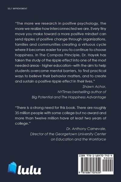 "The more we research in positive psychology, the more we realize how interconnected we are. Every tiny move you make toward a more positive mindset can send ripples of positive change through organizations, families and communities creating a virtuous cycle where it becomes easier for you to continue to choose happiness. In The Compass Principle, Dr. Hayek has taken the study of the ripple effect into one of the most needed areas-- higher education--with the aim to help students overcome mental barriers, to find practical ways to believe their behavior matters, and to create and sustain a positive ripple effect in their lives." Shawn Achor, NYTimes bestselling author of Big Potential and The Happiness Advantage "There is a strong need for this book. There are roughly 35 million people with some college but no award and more than twelve million have at least two years of college." Dr. Anthony Carnevale, Director of the Georgetown University Center on Education and the Workforce