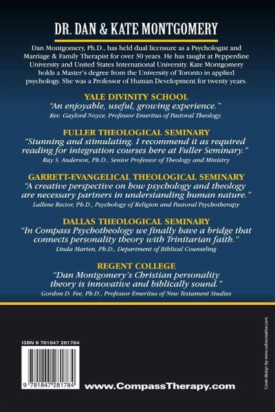 Dr. Dan and Kate Montgomery's masterwork on integrating psychology and theology has practical application in the fields of pastoral ministry, counseling, personality theory, and discipleship. Praised by professors at Yale, Fuller, Gordon-Conwell, Garrett-Evangelical, University of Dubuque, Andover Newton, and Dallas theological seminaries, the Self Compass® growth tool produces personality transformation, strengthens relationships, and increases intimacy with God. Dr. Ray Anderson calls the book "stunning and stimulating; recommended as required reading here at Fuller Theological Seminary." Theologian Gabriel Fackre writes: "Thank you, Dan and Kate Montgomery, for this remarkable mating of theology and psychology."