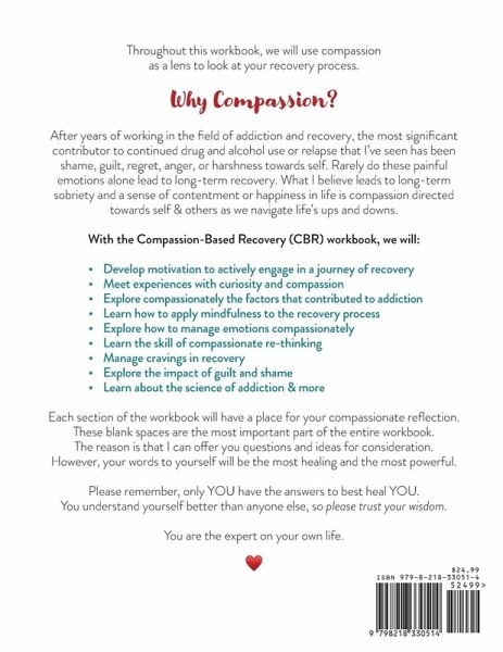 Throughout this workbook, we will use compassion as a lens to look at your recovery process. Why Compassion? After years of working in the field of addiction and recovery, the most significant contributor to continued drug and alcohol use or relapse that I've seen has been shame, guilt, regret, anger, or harshness towards self. Rarely do these painful emotions alone lead to long-term recovery. What I believe leads to long-term sobriety and a sense of contentment or happiness in life is compassion directed towards self & others as we navigate life's ups and downs. With the Compassion-Based Recovery (CBR) workbook, we will: Develop motivation to actively engage in a journey of recovery Meet experiences with curiosity and compassion Explore compassionately the factors that contributed to addiction Learn how to apply mindfulness to the recovery process Explore how to manage emotions compassionately Learn the skill of compassionate re-thinking Manage cravings in recovery Explore the impact of guilt and shame Learn about the science of addiction & more Each section of the workbook will have a place for your compassionate reflection. These blank spaces are the most important part of the entire workbook. The reason is that I can offer you questions and ideas for consideration. However, your words to yourself will be the most healing and the most powerful. Please remember, only YOU have the answers to best heal YOU. You understand yourself better than anyone else, so please trust your wisdom. You are the expert on your own life.