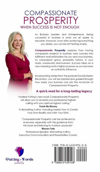 Have you ever felt like giving up? Even though your business has gone from success to success, you can feel that something is missing. Have you discovered that success is not enough? That something is compassion. It is so simple that you will ask, "Why did no one tell me this?" Compassionate Prosperity is your guidebook to discovering the highest purpose of your business so that you can become an authentic influence with a legacy worth living. In this award-winning book, Compassionate Prosperity, Andrea Putting uncovers how compassion projects in business turn success into fulfilment and satisfaction for you and your business. As compassion grows, prosperity follows, in your team, community and business. Success takes on a new meaning and a higher purpose as you develop a legacy as an authentic influence. Stories from Andrea's podcast Social Mission Revolution will inspire you and show you how easily your business can join the revolution of compassion in business. A quick read for a long-lasting legacy Money makes the world go around.....or does it? Business leaders and entrepreneurs are often driven by money however it's those that are driven by something greater than themselves, doing or giving something that can assist others, that's when success takes on a different meaning. Andrea lives and breathes a selfless devotion to helping others in all walks of life from around the world. Her insight into human behaviour and her giving of time to those who seek her compassion and guidance has helped many people on their journey of discovery and prosperity. Knowledge gained serves only one, knowledge shared serves thousands. Andrea continues her search for knowledge through her podcast whilst sharing with many others who tune in. Compassionate prosperity can be achieved by everyone, especially with the guidance from this book and listening to Andrea's podcast. Warren Tate - Professional Speaker, Best-selling Author, Executive Communication and Presentation Coach. "Philanthro-Capitalism: taking the best of philanthropy (love), jettisoning the worst (charity), and combining it with the best of capitalism (free enterprise) and getting rid of the worst (greed). This is exactly what you'll find in Andrea Putting's new book Compassionate Prosperity. This book will allow you to dovetail your professional highest calling with your spiritual highest calling." - Frank McKinney 7x Bestselling Author, including Aspire! How to Create Your Own Reality and Alter Your DNA. TheAspireBook.com Compassionate Prosperity is for Business Leaders and Entrepreneurs ready for a new purpose beyond success. Get your copy now and grow a legacy of compassion.
