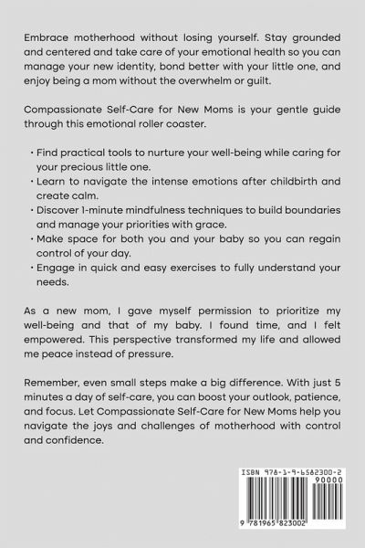 Let's Rewrite the Narrative of Motherhood Together This practical, heartfelt resource will teach you how to: Build emotional resilience and face motherhood's challenges with calm and confidence Set guilt-free boundaries and design a daily rhythm that nurtures both you and your baby Master quick self-care routines, mindfulness techniques, and stress-relieving strategies Communicate your needs effectively with your partner and loved ones Stay connected with your identity while embracing the transformative power of motherhood Inside, you'll find: One-minute self-care solutions to instantly shift your mindset and restore your energy 10-minute daily plans designed to reduce stress and create balance Healthy, easy-to-prep meals to keep you nourished without sacrificing precious time Reflection prompts and affirmations to deepen your self-awareness and confidence Tools for managing relationships and expectations so you can feel supported every step of the way