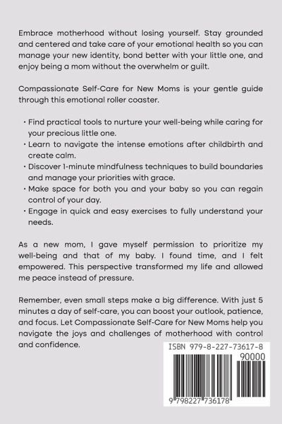 Don't go through all the feels alone! An amazing resource for postpartum health that guides you to stay centered and grounded while you care for your precious little one. Take care of your emotional health and embrace motherhood without losing yourself. Manage your new identity without the overwhelm or guilt, and feel peace instead of pressure. Are you navigating the whirlwind of excitement, responsibility, and exhaustion that is new motherhood? Do you feel like you're constantly firefighting, addressing everyone else's needs, and neglecting your own? Is it as if the person you used to be is slipping away, and you're not quite sure how to reclaim her? If so, you're in the right place. Navigating new motherhood is tough. The unexpected challenges, sleep deprivation, and constant demands can all feel overwhelming. And in the whirlwind of caring for your baby, it's easy to forget about caring for yourself. But here's the thing: You matter, too. Compassionate Self-Care for New Moms guides you through the complex emotional landscape of new motherhood, giving you relatable tools to nurture your emotional and physical well-being while you nurture your baby. This game-changing resource is brimming with tools and techniques that will empower you to navigate new motherhood with confidence and grace. Explore:Tips for addressing the overwhelm and handling the intense emotions after childbirth so you can be a calm, safe space for your little one 1-Minute Mindfulness techniques to build boundaries and manage your priorities with grace Maintain effective communication with your partner and get the support you need Strategies to make space for you and your baby so you can remain in control of your day without the guilt Maintain personal connections so you can keep in touch with your tribe and feel included 30 quick, healthy meal options to keep you nourished and energetic Manage your expectations: Be your best supporter and your best friend An efficient 10-minute daily plan carefully designed with new moms in mind to manage stress and promote happiness Empowering mental exercises to deepen your understanding of your needs so you can cherish this precious time However, you might think, "I'm already overwhelmed with the duties of new motherhood. How can I make time for self-care?" It is all about small but meaningful increments. Even as little as 5 minutes a day of self-awareness and self-acknowledgement can significantly impact your daily outlook, patience level, and focus. It's doable, and it's worth it. As a new mom, I gave myself permission to prioritize my well-being and that of my baby, discovering along the way how mental strength and peace come from taking control of the environment. Join me in exploring how empowering it can be to put yourself and your little one first. How would it feel to give yourself the care that you need, and deserve? Join me in exploring the profound joys of motherhood with a calm heart and a spacious day.