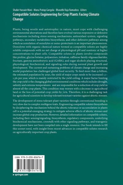 The development of stress tolerant plant varieties through conventional breeding is very slow due to complex multigene traits. Engineering compatible solutes biosynthesis by deciphering the mechanism behind the abiotic tolerance or accumulation in plants cell is a potential emerging strategy to mitigate adverse effects of abiotic stresses and increase global crop production. However, detailed information on compatible solutes, including their sensing/signaling, biosynthesis, regulatory components, underlying biochemical mechanisms, crosstalk with other signaling pathways, and transgenic development have not been compiled into a single resource. Our book intends to fill this unmet need, with insight from recent advances in compatible solutes research on agriculturally important crop plants.