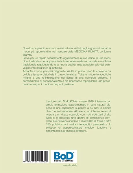 Questo compendio e un sommario ed una sintesi degli argomenti trattati in modo piu approfondito nel manuale della MEDICINA RIUNITA conforme alla vita. Serve per un rapido orientamento riguardante le nuove visioni di una medicina riunificata che rappresenta la fusione tra medicina naturale e medicina tradizionale raggiungendo una nuova qualita, resa possibile solo dal coinvolgimento della fisica quantistica. Accanto a nuovi percorsi diagnostici risulta in primo piano le coesione tra cellule e tessuto disturbata in caso di malattia. Tutte le misure terapeutiche mirano a una re-integrazione nel senso di una coerenza collettiva. Il cambiamento di coscienza necessario a tal fine rappresenta una sfida appagante sia per il medico che per il paziente. L'autore, il dott. Bodo Köhler, è un medico internista con una vasta formazione complementare in medicina naturale e vanta oltre 50 anni di esperienza in cliniche e nel proprio studio privato. Grazie a un intenso lavoro di ricerca e a un vivace scambio con scienziati di alto livello, ha acquisito una vasta gamma di conoscenze. Oltre a diversi libri specialistici e oltre 150 pubblicazioni, ne sono il risultato metodi terapeutici propri e lo sviluppo di dispositivi medici. L'autore è docente in Germania e all'estero.