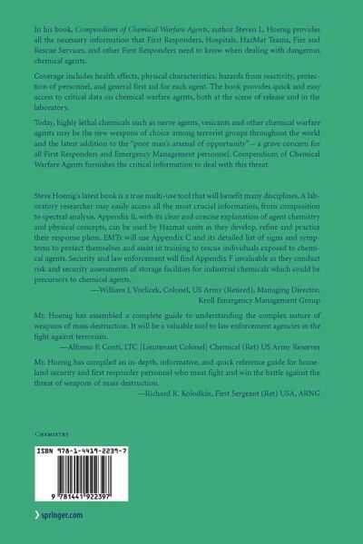 In his book, Compendium of Chemical Warfare Agents, author Steven L. Hoenig provides all the necessary information that First Responders, Hospitals, HazMat Teams, Fire and Rescue Services, and other First Responders need to know when dealing with dangerous chemical agents.