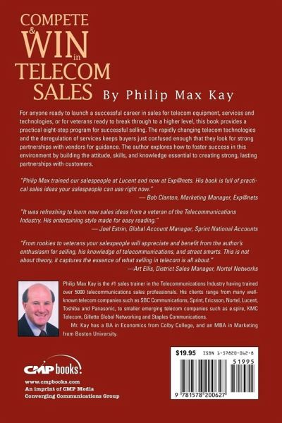 Philip Max Kay is the #1 sales trainer in the telecommunications industry, having trained over 5,000 telecommunications sales professionals. His clients range from many well-known telecom companies such as SBC Communications, Sprint, Ericsson, Nortel, Lucent, Toshiba and Panasonic, to small emerging telecom companies such as e.spire, KMC Telecom, Gillette Gobal Networking and Staples Communications. Mr. Kay has a B.A. in economics from Colby College, and an MBA in marketing from Boston University.