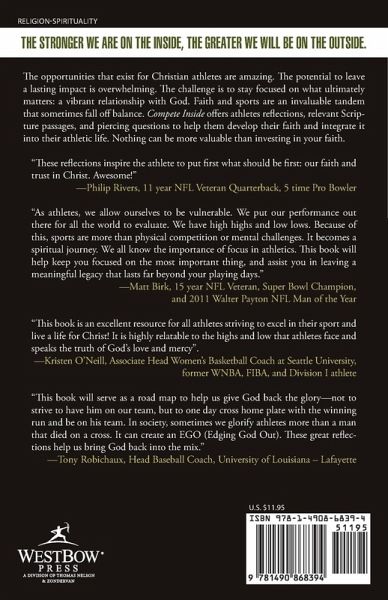 The opportunities that exist for Christian athletes are amazing. The potential to leave a lasting impact is overwhelming. The challenge is to stay focused on what ultimately matters: a vibrant relationship with God. Faith and sports are an invaluable tandem that sometimes fall off balance. Compete Inside offers athletes reflections, relevant Scripture passages, and piercing questions to help them develop their faith and integrate it into their athletic life. Nothing can be more valuable than investing in your faith. "These reflections inspire the athlete to put first what should be first: our faith and trust in Christ. Awesome!" -Philip Rivers, 11 year NFL Veteran Quarterback, 5 time Pro Bowler "As athletes, we allow ourselves to be vulnerable. We put our performance out there for all the world to evaluate. We have high highs and low lows. Because of this, sports are more than physical competition or mental challenges. It becomes a spiritual journey. We all know the importance of focus in athletics. This book will help keep you focused on the most important thing, and assist you in leaving a meaningful legacy that lasts far beyond your playing days." -Matt Birk, 15 year NFL Veteran, Super Bowl Champion, and 2011 Walter Payton NFL Man of the Year "This book is an excellent resource for all athletes striving to excel in their sport and live a life for Christ! It is highly relatable to the highs and low that athletes face and speaks the truth of God's love and mercy". -Kristen O'Neill, Associate Head Women's Basketball Coach at Seattle University, former WNBA, FIBA, and Division I athlete "This book will serve as a road map to help us give God back the glory-not to strive to have him on our team, but to one day cross home plate with the winning run and be on his team. In society, sometimes we glorify athletes more than a man that died on a cross. It can create an EGO (Edging God Out). These great reflections help us bring God back into the mix." -Tony Robichaux, Head Baseball Coach, University of Louisiana - Lafayette