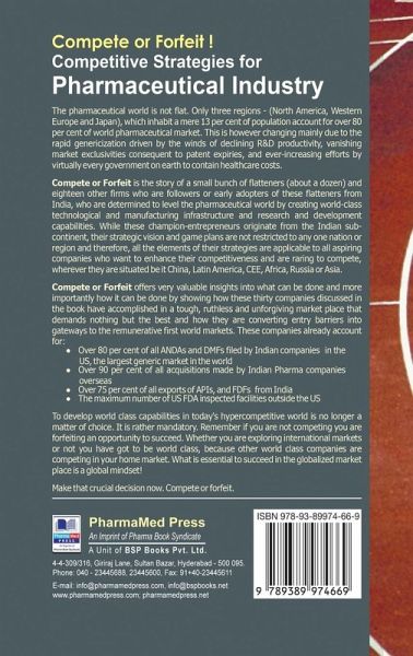 The pharmaceutical world is not flat. Only three regions - (North America, Western Europe and Japan), which inhabit a mere 13 per cent of population account for over 80 per cent of world pharmaceutical market. This is however changing mainly due to the rapid genericization driven by the winds of declining R&D productivity, vanishing market exclusivities consequent to patent expiries, and ever-increasing efforts by virtually every government on earth to contain healthcare costs. Compete or Forfeit is the story of a small bunch of flatteners (about a dozen) and eighteen other firms who are followers or early adopters of these flatteners from India, who are determined to level the pharmaceutical world by creating world-class technological and manufacturing infrastructure and research and development capabilities. While these champion-entrepreneurs originate from the Indian sub-continent, their strategic vision and game plans are not restricted to any one nation or region and therefore, all the elements of their strategies are applicable to all aspiring companies who want to enhance their competitiveness and are raring to compete, wherever they are situated be it China, Latin America, CEE, Africa, Russia or Asia. Compete or Forfeit offers very valuable insights into what can be done and more importantly how it can be done by showing how these thirty companies discussed in the book have accomplished in a tough, ruthless and unforgiving market place that demands nothing but the best and how they are converting entry barriers into gateways to the remunerative first world markets. These companies already account for: Over 80 per cent of all ANDAs and DMFs filed by Indian companies in the US, the largest generic market in the world Over 90 per cent of all acquisitions made by Indian Pharma companies overseas Over 75 per cent of all exports of APIs, and FDFs from India The maximum number of US FDA inspected facilities outside the US To Develop World Class capabilities in todays hyper competitive world is no longer a matter of choice. It is rather mandatory.Remember if you are not competing you are forfeiting an opportunity to succeed.