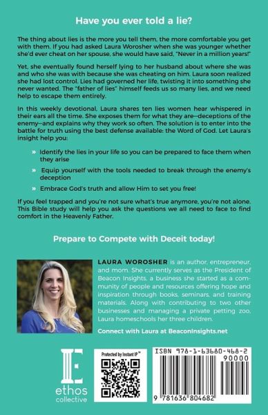 Have you ever told a lie? The thing about lies is the more you tell them, the more comfortable you get with them. If you had asked Laura Worosher when she was younger whether she'd ever cheat on her spouse, she would have said, "Never in a million years!" Yet, she eventually found herself lying to her husband about where she was and who she was with because she was cheating on him. Laura soon realized she had lost control. Lies had governed her life, twisting it into something she never wanted. The "father of lies" himself feeds us so many lies, and we need help to escape them entirely. In this weekly devotional, Laura shares ten lies women hear whispered in their ears all the time. She exposes them for what they are-deceptions of the enemy-and explains why they work so often. The solution is to enter into the battle for truth using the best defense available: the Word of God. Let Laura's insight help you: Identify the lies in your life so you can be prepared to face them when they arise Equip yourself with the tools needed to break through the enemy's deception Embrace God's truth and allow Him to set you free! If you feel trapped and you're not sure what's true anymore, you're not alone. This Bible study will help you ask the questions we all need to face to find comfort in the Heavenly Father. Prepare to Compete with Deceit today!