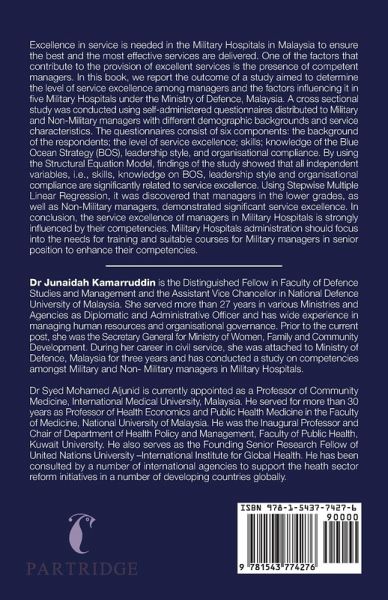 Excellence in service is needed in the Military Hospitals in Malaysia to ensure the best and the most effective services are delivered. One of the factors that contribute to the provision of excellent services is the presence of competent managers. In this book, we report the outcome of a study aimed to determine the level of service excellence among managers and the factors influencing it in five Military Hospitals under the Ministry of Defence, Malaysia. A cross sectional study was conducted using self-administered questionnaires distributed to Military and Non-Military managers with different demographic backgrounds and service characteristics. The questionnaires consist of six components: the background of the respondents; the level of service excellence; skills; knowledge of the Blue Ocean Strategy (BOS), leadership style, and organisational compliance. By using the Structural Equation Model, findings of the study showed that all independent variables, i.e., skills, knowledge on BOS, leadership style and organisational compliance are significantly related to service excellence. Using Stepwise Multiple Linear Regression, it was discovered that managers in the lower grades, as well as Non-Military managers, demonstrated significant service excellence. In conclusion, the service excellence of managers in Military Hospitals is strongly influenced by their competencies. Military Hospitals administration should focus into the needs for training and suitable courses for Military managers in senior position to enhance their competencies.