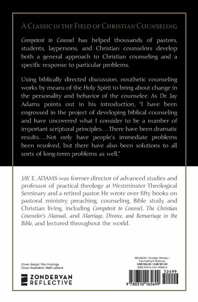 A classic in the field of Christian counseling, Competent to Counsel is one of the first works to fully articulate a vision of "nouthetic" counseling--a strictly biblical approach to behavioral counseling and therapy. Dr. Jay Adams defends the idea that the Bible itself, as God's Word, provides all the principles needed for understanding and engaging in holistic counseling. Using biblically directed discussion, nouthetic counseling works by means of the Holy Spirit to bring about change--both immediate and long-term--in the personality and behavior of the counselee. As he points out in his introduction, "I have been engrossed in the project of developing biblical counseling and have uncovered what I consider to be a number of important scriptural principles. . . There have been dramatic results. . . Not only have people's immediate problems been resolved, but there have also been solutions to all sorts of long-term problems as well." Competent to Counsel has helped thousands of pastors, students, laypersons, and Christian counselors develop: * A general approach to (and theology of) Christian counseling. * Specific, practical responses to particular problems useful for teaching, study, and personal application. Since its first publication in 1970, this book has gone through over thirty printings. It establishes the basis for and an introduction to a counseling approach that is being used in pastors' studies, in counseling centers, and across dining room tables throughout the country and around the world.