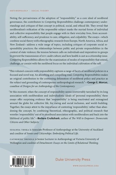 Noting the pervasiveness of the adoption of "responsibility" as a core ideal of neoliberal governance, the contributors to Competing Responsibilities challenge contemporary understandings and critiques of that concept in political, social, and ethical life. They reveal that neoliberalism's reification of the responsible subject masks the myriad forms of individual and collective responsibility that people engage with in their everyday lives, from accountability, self-sufficiency, and prudence to care, obligation, and culpability. The essays-which combine social theory with ethnographic research from Europe, North America, Africa, and New Zealand-address a wide range of topics, including critiques of corporate social responsibility practices; the relationships between public and private responsibilities in the context of state violence; the tension between calls on individuals and imperatives to groups to prevent the transmission of HIV; audit culture; and how health is cast as a citizenship issue. Competing Responsibilities allows for the examination of modes of responsibility that extend, challenge, or coexist with the neoliberal focus on the individual cultivation of the self. Contributors Barry D. Adam, Elizabeth Anne Davis, Filippa Lentzos, Jessica Robbins-Ruszkowski, Nikolas Rose, Rosalind Shaw, Cris Shore, Jessica M. Smith, Susanna Trnka, Catherine Trundle, Jarrett Zigon