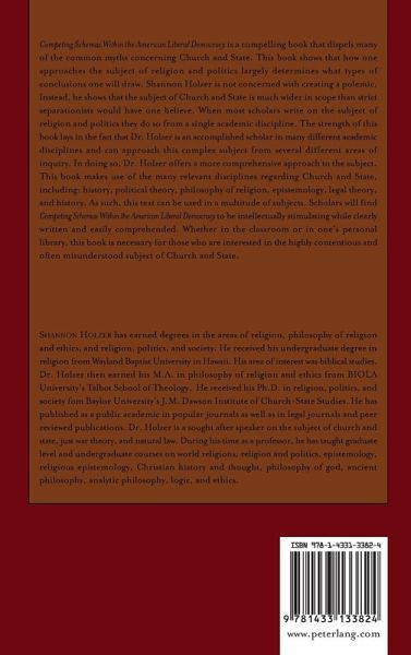 Competing Schemas Within the American Liberal Democracy is a compelling book that dispels many of the common myths concerning Church and State. This book shows that how one approaches the subject of religion and politics largely determines what types of conclusions one will draw. Shannon Holzer is not concerned with creating a polemic. Instead, he shows that the subject of Church and State is much wider in scope than strict separationists would have one believe. When most scholars write on the subject of religion and politics they do so from a single academic discipline. The strength of this book lays in the fact that Dr. Holzer is an accomplished scholar in many different academic disciplines and can approach this complex subject from several different areas of inquiry. In doing so, Dr. Holzer offers a more comprehensive approach to the subject. This book makes use of the many relevant disciplines regarding Church and State, including: history, political theory, philosophy of religion, epistemology, legal theory, and history. As such, this text can be used in a multitude of subjects. Scholars will find Competing Schemas Within the American Liberal Democracy to be intellectually stimulating while clearly written and easily comprehended. Whether in the classroom or in one's personal library, this book is necessary for those who are interested in the highly contentious and often misunderstood subject of Church and State.