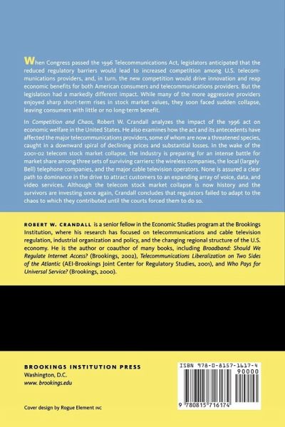 " The 1996 Telecommunications Act was an attempt to increase competition among telecommunications providers in the United States by reducing regulatory barriers to market entry. This competition was expected to drive innovation in the telecommunications sector and reap economic benefits for both American consumers and telecommunications providers. The legislation, however, had a markedly different impact. While many of the more aggressive providers enjoyed sharp short-term rises in stock market values, they soon faced sudden collapse, leaving consumers with little or no long-term benefit. In Competition and Chaos, Robert W. Crandall analyzes the impact of the 1996 act on economic welfare in the United States and how the act and its antecedents affected the major telecommunications providers. He argues that the act was far too stringent, inviting the Federal Communications Commission and state regulators to micromanage competitive entry into local telecommunications markets. Combined with the bursting of the dot.com and telecom stock market bubbles, this aggressive policy invited new and existing firms to invest billions of dollars unwisely, leading to the 200102 collapse of equity values throughout the sector. New entrants into the market invested more than $50 billion in unproductive assets that were quickly wiped out through massive failures. The 1996 act allowed the independent long-distance companies, such as MCI and AT&T, to live a few years longer. But today they are a threatened species, caught in a downward spiral of declining prices and substantial losses. The industry is preparing for an intense battle for market share among three sets of carriers: the wireless companies, the local telephone carriers, and the cable television businesses. Each has its own particular advantage in one of the three major segments of the marketvoice, data, and videobut none is assured a clear path to dominance. Although the telecom stock market collapse i"