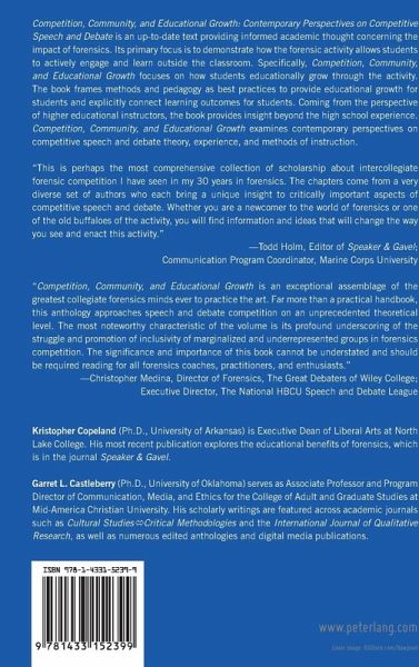 Competition, Community, and Educational Growth: Contemporary Perspectives on Competitive Speech and Debate is an up-to-date text providing informed academic thought concerning the impact of forensics. Its primary focus is to demonstrate how the forensic activity allows students to actively engage and learn outside the classroom. Specifically, Competition, Community, and Educational Growth focuses on how students educationally grow through the activity. The book frames methods and pedagogy as best practices to provide educational growth for students and explicitly connect learning outcomes for students. Coming from the perspective of higher educational instructors, the book provides insight beyond the high school experience. Competition, Community, and Educational Growth examines contemporary perspectives on competitive speech and debate theory, experience, and methods of instruction.