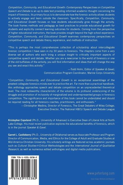 Competition, Community, and Educational Growth: Contemporary Perspectives on Competitive Speech and Debate is an up-to-date text providing informed academic thought concerning the impact of forensics. Its primary focus is to demonstrate how the forensic activity allows students to actively engage and learn outside the classroom. Specifically, Competition, Community, and Educational Growth focuses on how students educationally grow through the activity. The book frames methods and pedagogy as best practices to provide educational growth for students and explicitly connect learning outcomes for students. Coming from the perspective of higher educational instructors, the book provides insight beyond the high school experience. Competition, Community, and Educational Growth examines contemporary perspectives on competitive speech and debate theory, experience, and methods of instruction.