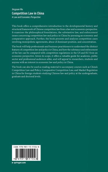 This book offers a comprehensive introduction to the developmental history and structural framework of Chinese competition law from a law and economics perspective. It examines the philosophical foundations, the substantive law, and enforcement issues concerning competition law and policy in China by pursuing an economic and comparative approach. Further, the book presents and analyzes competition cases involving monopolistic agreements, abuse of dominant position, and concentration. The book will help professionals and business practitioners to understand the distinct features of competition law and policy in China, and how the substance and enforcement of the law can be compared with competition regulations in the US and EU from an economic perspective. Given its scope, it offers a valuable guide for academic, public sector and professional audiences alike, and will appeal to researchers, students and anyone with an interest in economic law and policy in China. The book can also be used as reading material to accompany courses such as China's Competition Law and Policy, Comparative Competition Law, and Market Regulation in China for foreign students studying Chinese law and policy at the undergraduate, graduate and doctoral levels.
