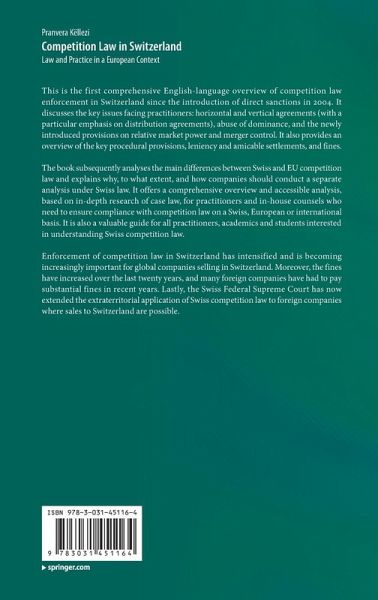 The book subsequently analyses the main differences between Swiss and EU competition law and explains why, to what extent, and how companies should conduct a separate analysis under Swiss law. It offers a comprehensive overview and accessible analysis, based on in-depth research of case law, for practitioners and in-house counsels who need to ensure compliance with competition law on a Swiss, European or international basis. It is also a valuable guide for all practitioners,academics and students interested in understanding Swiss competition law.