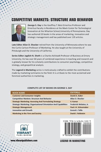 Competitive Markets: Structure and Behavior by George S. Day presents a deep dive into the dynamics of competition and market systems, showcasing how firms can better understand, adapt to, and influence the structure of their industries. This book includes a curated selection of Day's most influential writings that examine how firms behave in competitive settings-how they position themselves, respond to rivals, and shape their market environments. From market structure analysis to competitor profiling and adaptive strategy formulation, the book offers a blend of theory and practice that empowers marketers and strategists to decode complex market forces. Day's insights are especially valuable in industries undergoing disruption, consolidation, or rapid technological change. Part of the Legend in Marketing series, this book is essential for academics, business leaders, and students seeking a comprehensive understanding of competitive behavior and strategic interaction. These works remain highly relevant for developing sustainable advantage in today's dynamic and uncertain markets.