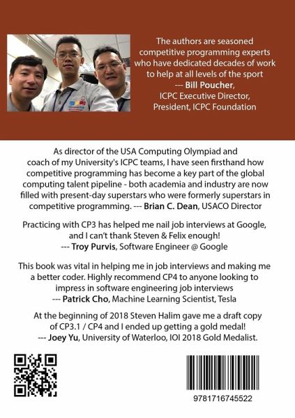 This Competitive Programming book, 4th edition (CP4) is a must have for every competitive programmer. Mastering the contents of this book is a necessary (but admittedly not sufficient) condition if one wishes to take a leap forward from being just another ordinary coder to being among one of the world's finest competitive programmers. Typical readers of Book 1 (only) of CP4 would include: (1). Secondary or High School Students who are competing in the annual International Olympiad in Informatics (IOI) (including the National or Provincial Olympiads) as Book 1 covers most of the current IOI Syllabus, (2). Casual University students who are using this book as supplementary material for typical Data Structures and Algorithms courses, (3). Anyone who wants to prepare for typical fundamental data structure/algorithm part of a job interview at top IT companies. Typical readers of both Book 1 + Book 2 of CP4 would include: (1). University students who are competing in the annual International Collegiate Programming Contest (ICPC) Regional Contests (including the World Finals) as Book 2 covers much more Computer Science topics that have appeared in the ICPCs, (2). Teachers or Coaches who are looking for comprehensive training materials, (3). Anyone who loves solving problems through computer programs. There are numerous programming contests for those who are no longer eligible for ICPC, including Google CodeJam, Facebook Hacker Cup, TopCoder Open, CodeForces contest, Internet Problem Solving Contest (IPSC), etc.
